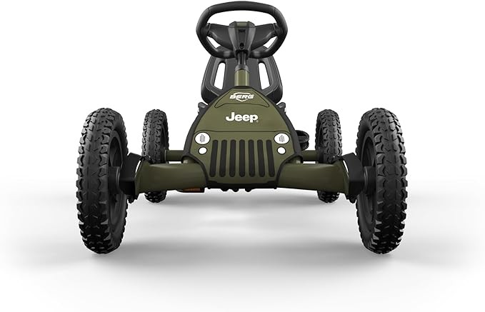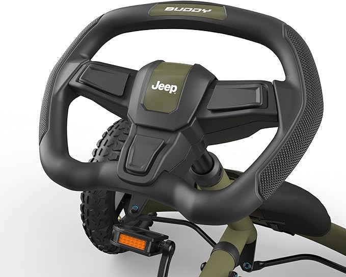The Buddy Jeep Junior Pedal Go-Kart features an adjustable seat, BFR system, pneumatic tires, and a swing axle. The adjustable seat is perfect for children ages 3-8 since it can be adjusted to grow with your child. The BFR (brake, freewheel, reverse) system makes pedaling easy for all children. With safety in mind, the pneumatic tires, and swing axle makes sure that all 4 wheels stay on the ground making any terrain achievable.