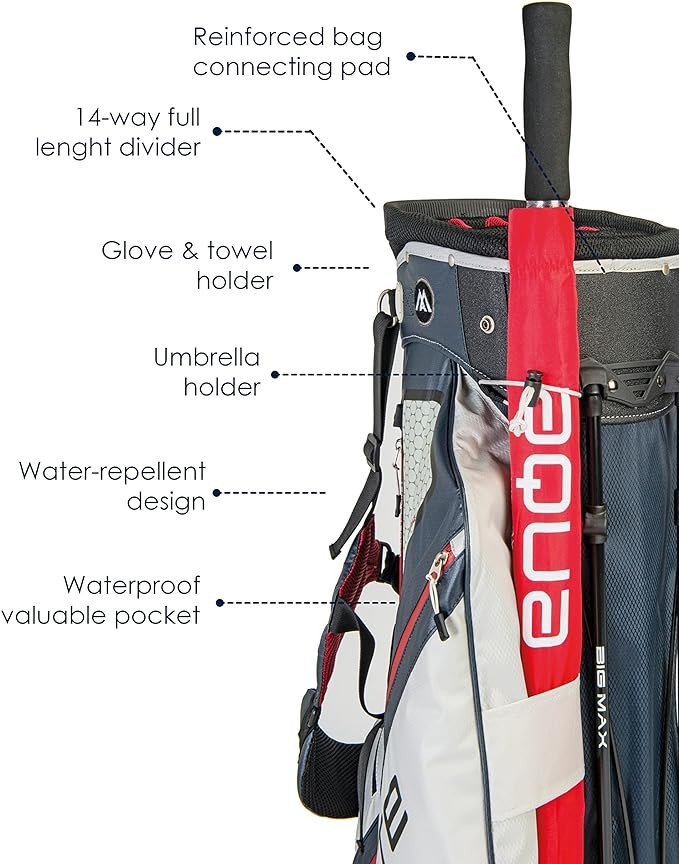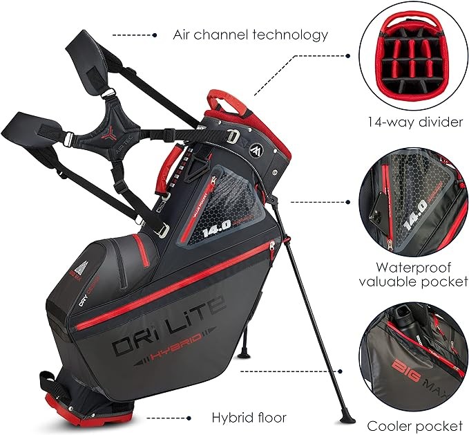 Introducing our Dri Lite Hybrid Tour golf stand & carry cart bag by BIG MAX - this is the perfect solution for golfers who prefer to push and carry! This innovative golf bag is water-repellent, ensuring that your equipment stays safe and dry, regardless of the weather. Its flat, footless golf push cart compatible base and leg lock feature keep the bag stable and secure when placed on a trolley, while the clever positioning of the stand mechanism prevents twisting.