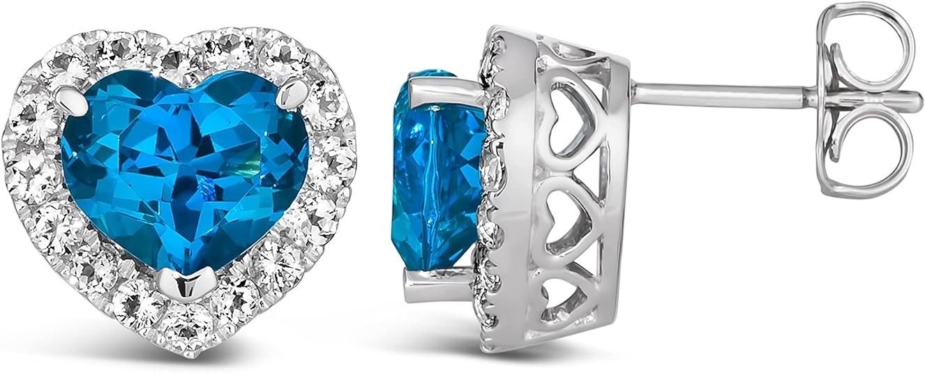 Carat Blue and White Topaz Heart Halo Stud Earrings for Women in 14k White Gold with Push Back by LeVian