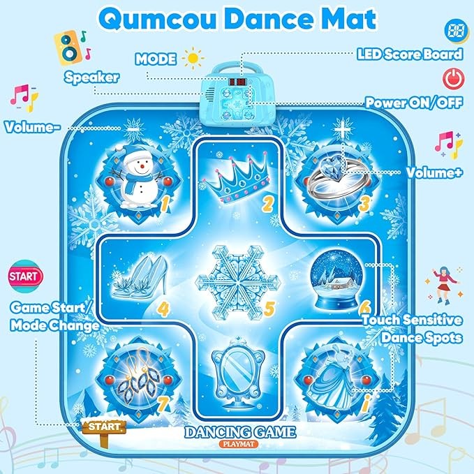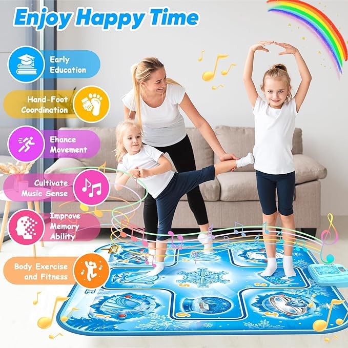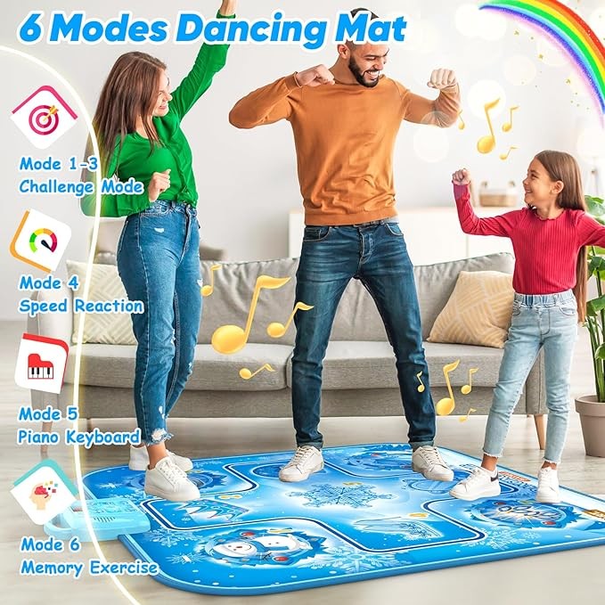 This dance mat is featured with upgrade 6 game modes, mode 1-3 is dancing challenge mode, which mainly exercise kids movement and hand-foot coordination ability, the challenge difficulty increase from mode 1 to mode 3.