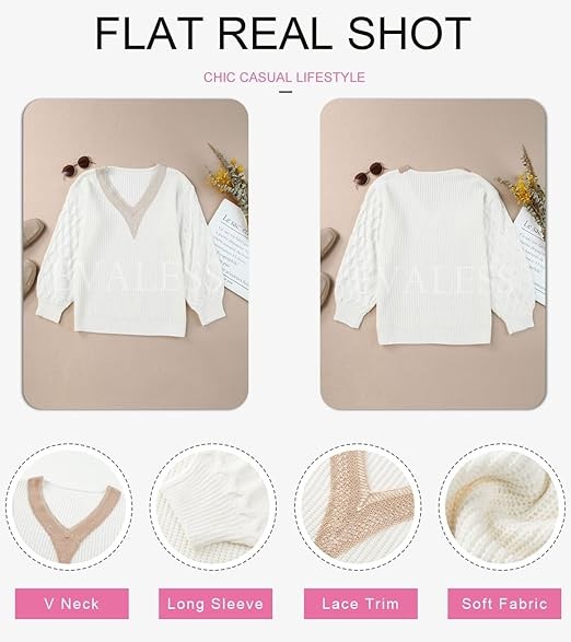 Made with high quality material, this sweater is designed to keep you stylish and comfortable throughout the season. The cute lace detailing is femininity and elegance. The V-neckline frames your face beautifully, while the long sleeves provide warmth and coverage.