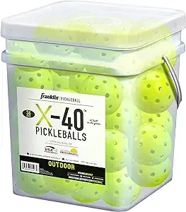 Franklin Sports' X-40 Pickleball Ball is designed for premium play and performance and is the official pickleball ball for the USA Pickleball Championship! The X-40 Outdoor Pickleball Ball is precision drilled and constructed from durable polyethylene , performs better than other pickleball balls on the market. Machine-drilled holes in each pickleball ball ensure a stable flight pattern and reliable spin on each ball, giving your pickleball game a consistent feel. Ultra-durable polyethylene construction resists denting and cracking, even on outdoor courts, so you can use it year-round. These X-40 pickleball balls are also rigorously tested for reliable bounce and spin so you can make perfect shots. Plus, the vibrant neon colors make the ball track easily in the air, increasing visibility on all court surfaces. Designed to United States Pickleball (USAPA) size and weight regulations, these official sized outdoor pickleball balls are perfect for recreational and tournament games. The Franklin X-40 Pickleball Ball is of professional quality and is the official outdoor pickleball ball of the U.S. Open Pickleball Championship. To help take your pickleball game to the next level, pick up your Franklin Sports X-40 Outdoor Pickleball Set today!