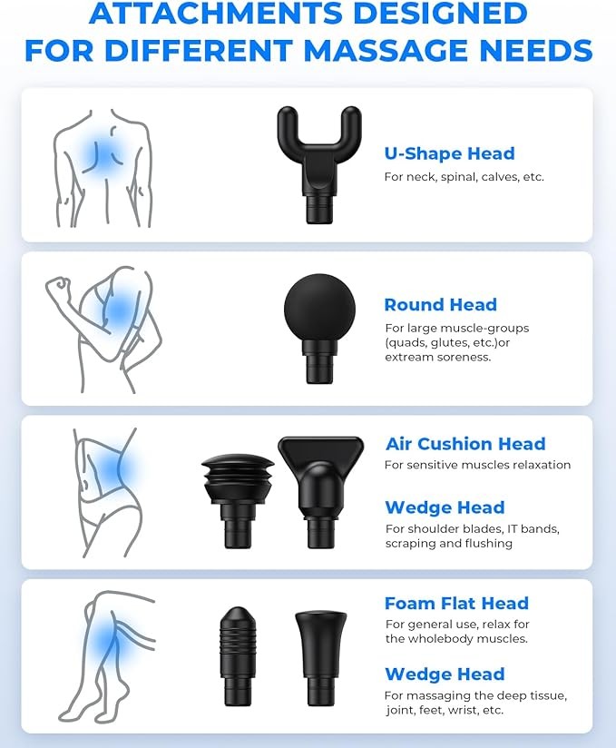 Powerful Muscle Relief:Our Deep tissue massage gun features a 12mm amplitude that deliver up to 50 lbs massage intensity to relieve your tight muscles.Whether you're a professional athlete seeking pain relief or simply looking to relax after a workout, this gun is designed to target sore muscles and provide maximum relief.