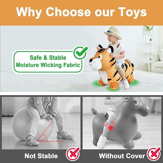 iPlay, iLearn Bouncy Pals Tiger Hopper Toy, Toddler Hopping Horse, Kid Plush Ride on Animal Bouncer W/Pump, Inflatable Bouncing Rider, Indoor Outdoor Jumping Birthday Gift 2 3 4 5 6 Year Old Boy Girl
