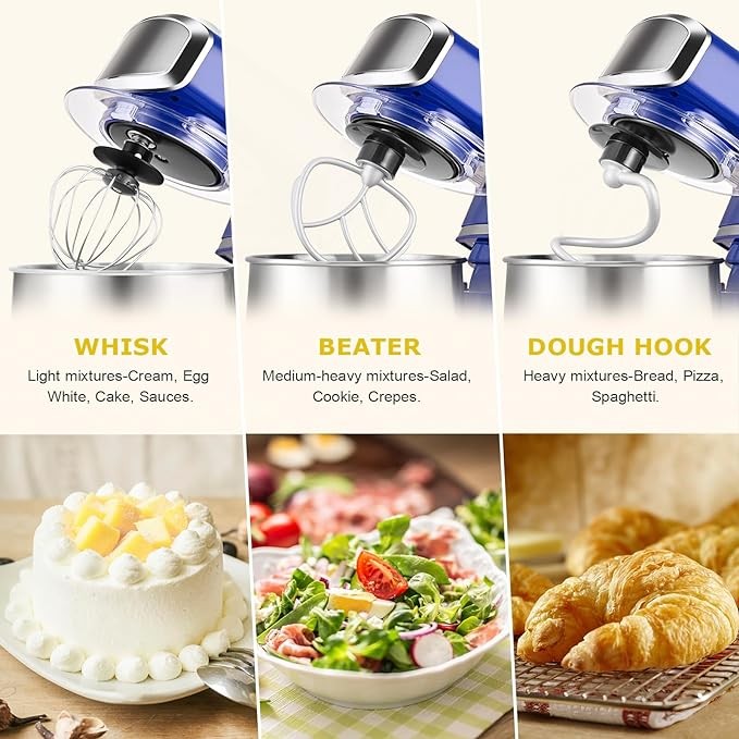 More importantly, our electric mixer upgraded the multi attachments, aluminium dough hook and flat beater, stainless steel whisk, more sturdy and durable. And there is a gasket at the top joint to prevent food residue from splashing into the joint,make cleaning more convenient.