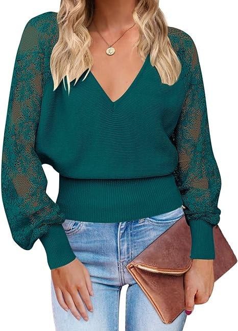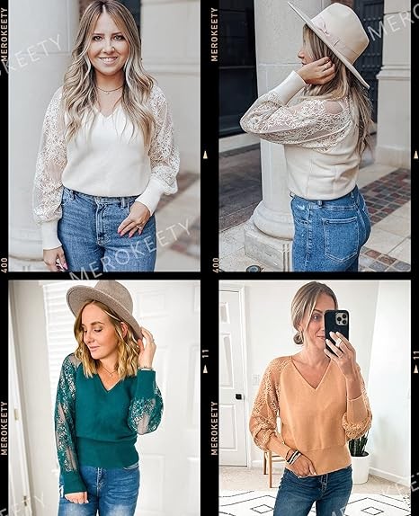 MEROKEETY Women's 2024 V Neck Lace Long Sleeve Ribbed Knit Sweater Solid Color Pullover Tops