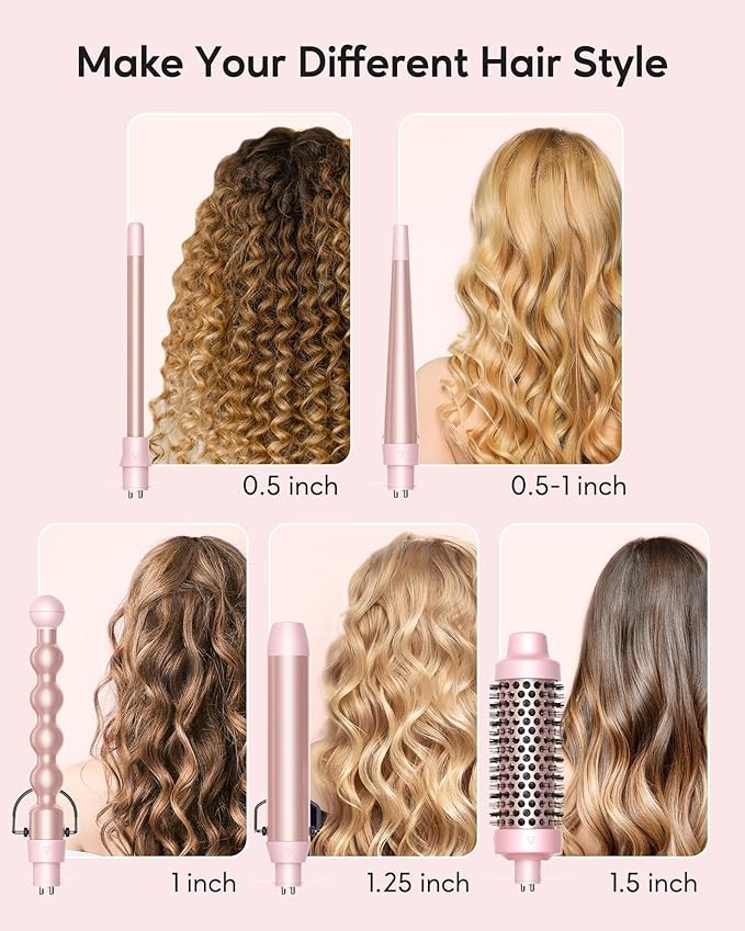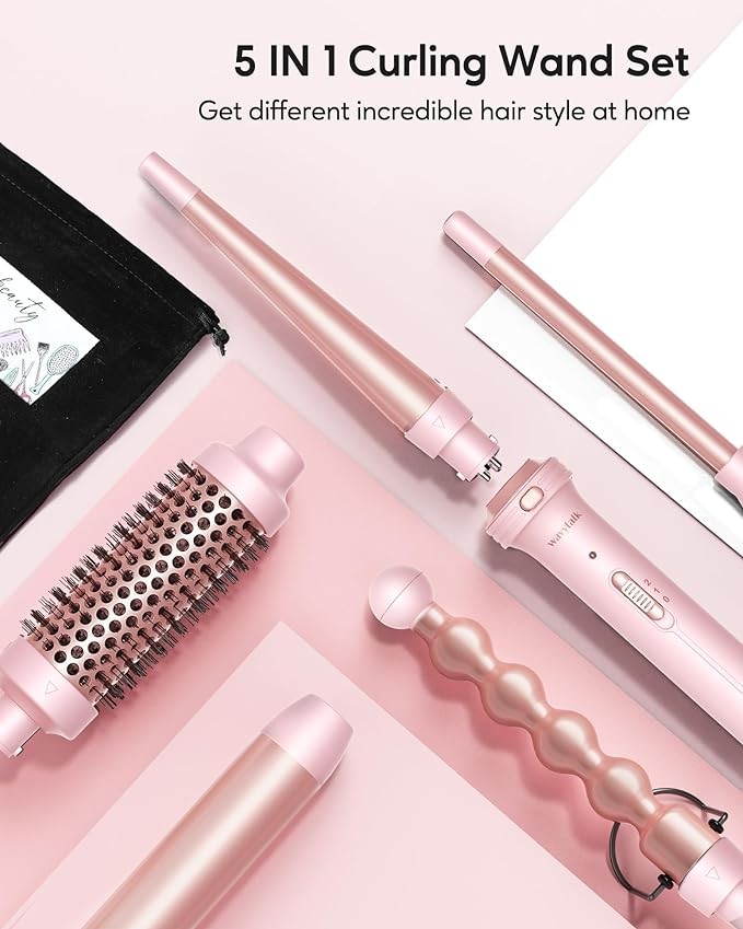 Wavytalk 5 in 1 Curling Iron,Curling Wand Set with Curling Brush and 4 Interchangeable Ceramic Curling Wand(0.5”-1.25”),Instant Heat Up,Include Heat Protective Glove & 2 Clips (Pink)